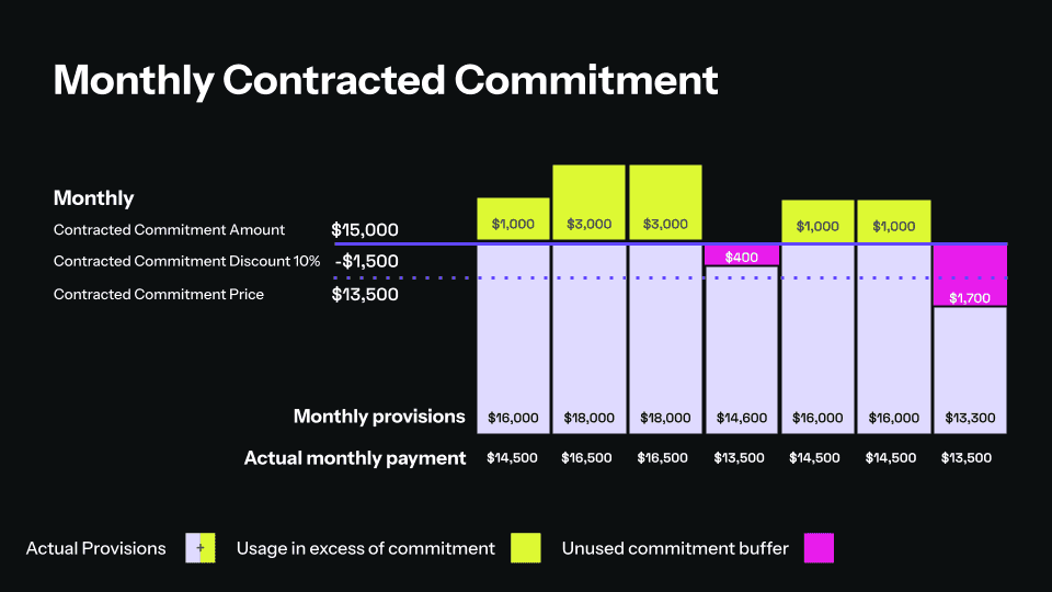 A commitment contract brings these two requirements together. You define a monthly or annual spending commitment amount that reflects what you likely expect to provision. In return, you receive a discount on the committed amount while retaining the ability to adjust platform resources as needed.