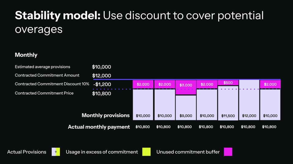 Other organizations prefer a model that reflects their real provisioning patterns as closely as possible. These teams usually want to receive some form of a discount but are comfortable with monthly variations.